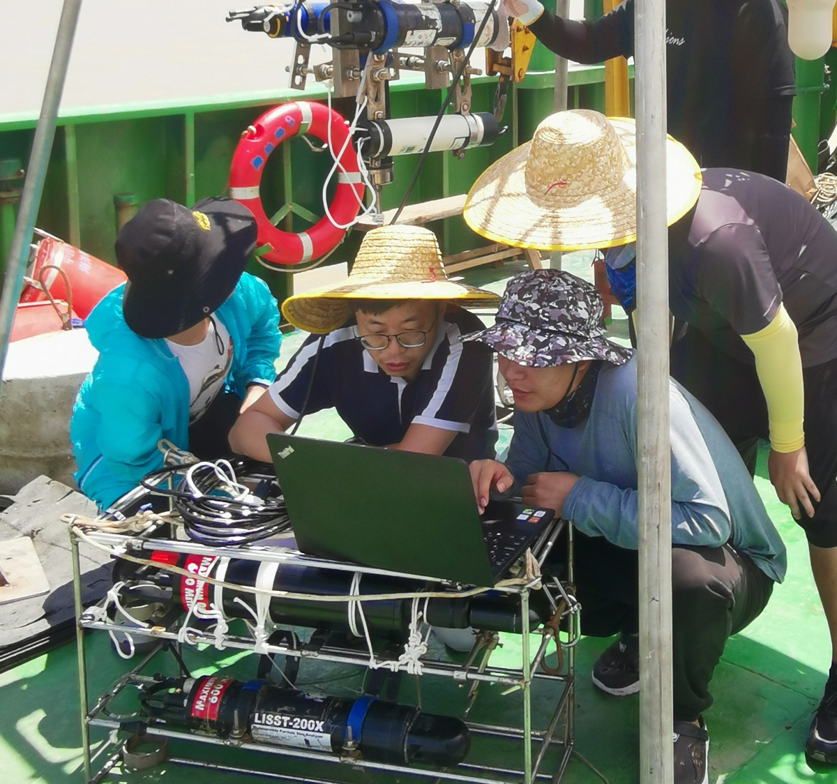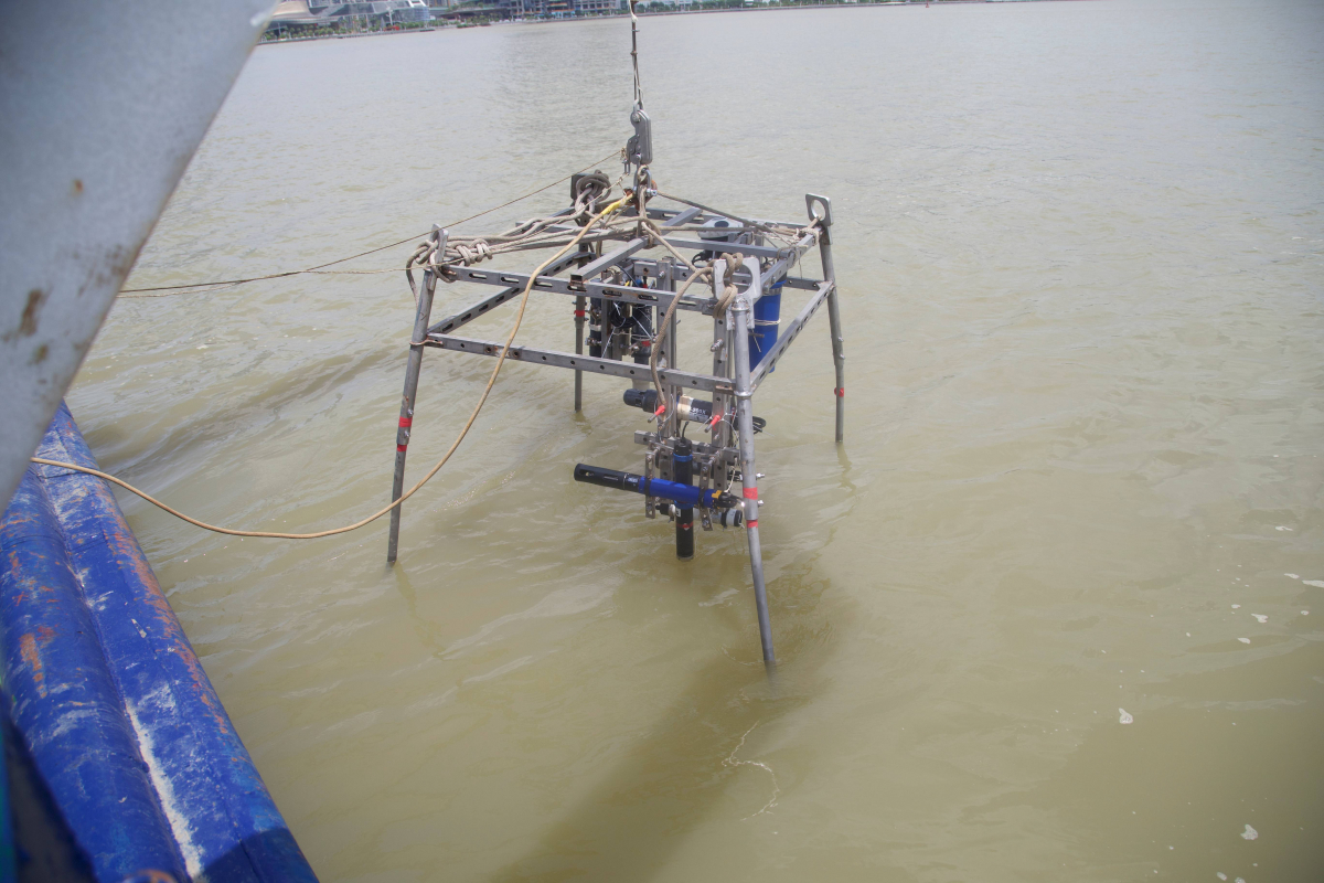 本航次由3船同步实施,包括8个走航断面以及3组7个定点站位的观测和取样。科考船上搭载了多参数水质仪YSI-EXO、LISST-200x、表层沉积物采集器、浅地层剖面仪等多种仪器。同时,结合团队自主设计研发的座底四角架底边界层观测系统,实现了研究区域悬浮颗粒生态动力过程、近底边界层泥沙输移、地貌演变等过程的高分辨率观测。航次执行期间,该海域东南季风盛行,现场海况较差,科考人员凭借刻苦耐劳的毅力和严谨务实的作风,克服了高温酷暑、大风大浪等恶劣天气和海况带来的影响,圆满地完成了预定的科考任务。