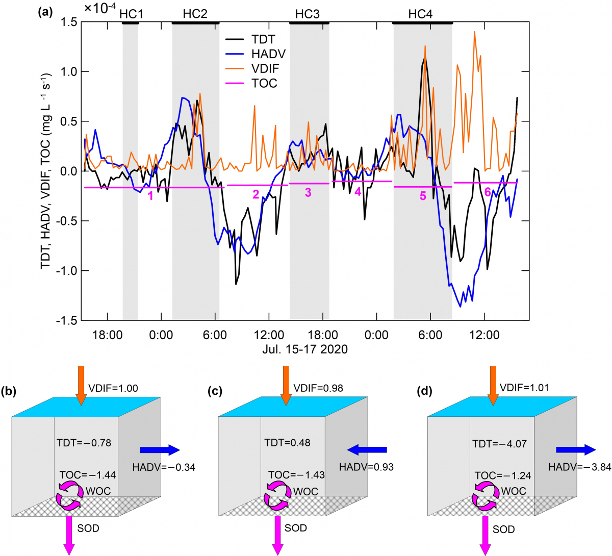 近日,我院吴加学教授研究团队基于潜标、座底四角架底边界层观测系统以及船载湍流剖面等现场观测与采样分析,结合河口水动力、沉积动力和生物地球化学等多学科理论与方法,系统探究了珠江河口再悬浮过程与有机颗粒耗氧对于夏季海底缺氧发育程度的影响。研究结果发现,珠江口缺氧区发生在富含有机质的泥质沉积带上,缺氧区水体内再悬浮会产生局部高浓度悬浮体,形成所谓的“次生的最大浑浊带”(Secondary Turbidity Maxima)。潮周期内溶解氧收支平衡分析显示,再悬浮颗粒引起的溶解氧耗氧通量与沉积物耗氧通量(SOD)相当(图1和2)。在不考虑再悬浮颗粒耗氧的情况下,溶解氧收支平衡将出现高估缺氧的发育程度,即缺氧区水体溶解氧浓度比实际的要偏高。由此可见,颗粒再悬浮过程在维持河口及近岸缺氧发育程度中起着不可忽略的重要作用,这一发现对于提升近岸河口缺氧发育的数值模拟精度也具有重要价值。