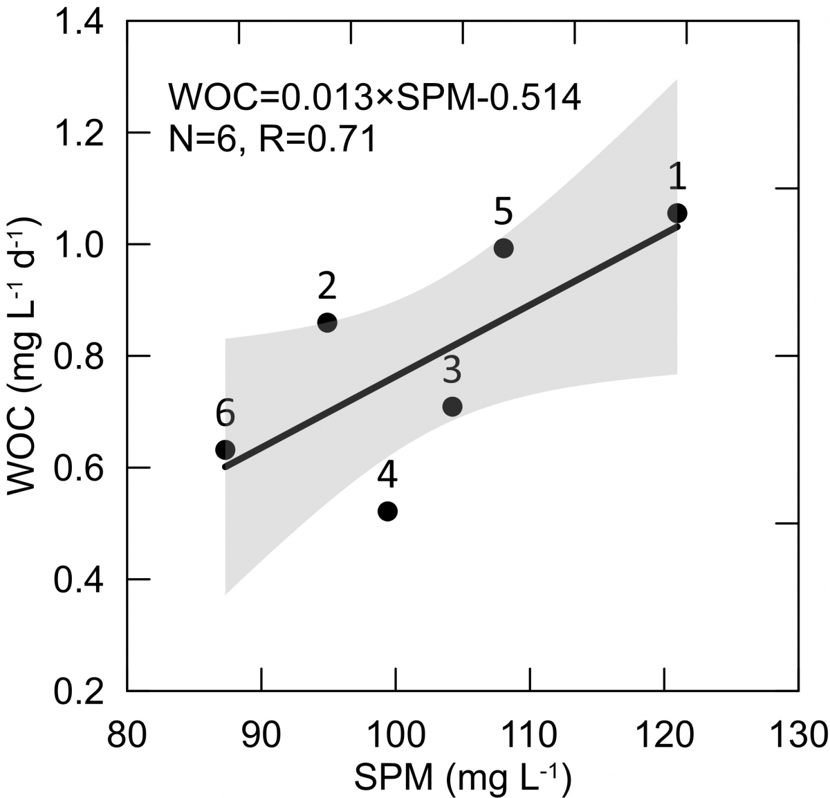 图2 海底缺氧发育区悬浮颗粒浓度与水体耗氧率之间的关系