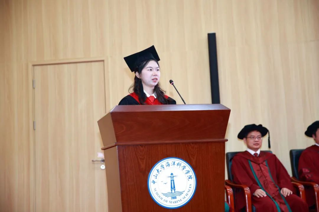 毕业生代表、连续三年获得国家奖学金的薛媛在发言中回顾自己的在校时光:“海纳百川”学术论坛启蒙她的科研初心,班级活动锻炼着她的综合能力……她说,对于未来,祝福我们大家永远保持从容,保持进步,心中有光,遨游深海。终有一天,我们会成为后来者前路上的光。