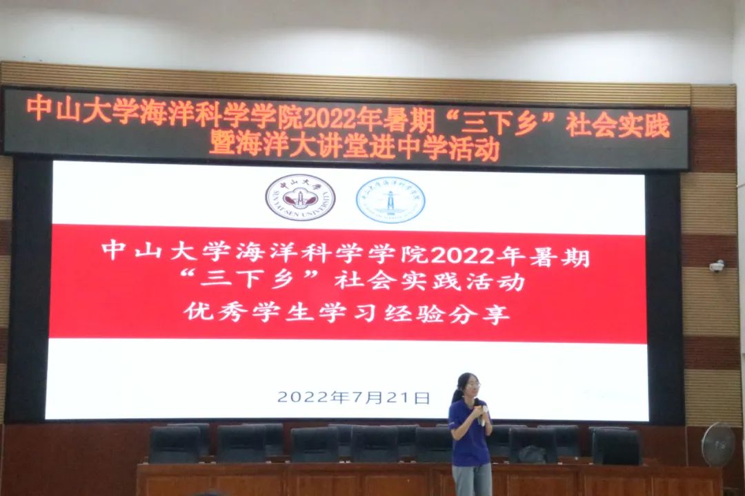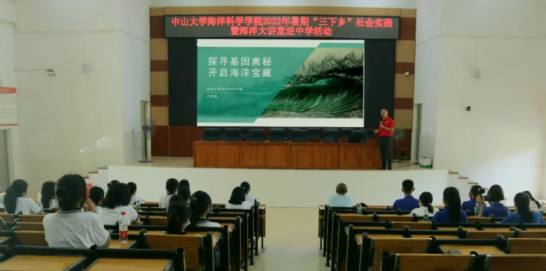 2022年7月21日下午,我院20余位师生来到暑期“三下乡”社会实践活动(紫金)第一站——紫金县中山高级中学,在此开展海洋大讲堂进中学暨学习经验分享活动,受到同学们和老师的热情欢迎。卢建国副教授作主题为“探寻基因奥秘,开启海洋宝藏”的科普讲座,带领同学们看到“山的那一边”,一同探寻海洋的奥秘和宝藏,在其心中播种一颗海洋梦的种子。此外,来自2020级海洋生物班的肖冰燕和2019级海洋地质班的胡杰伟结合个人经历,为在场的同学分享学习经验。