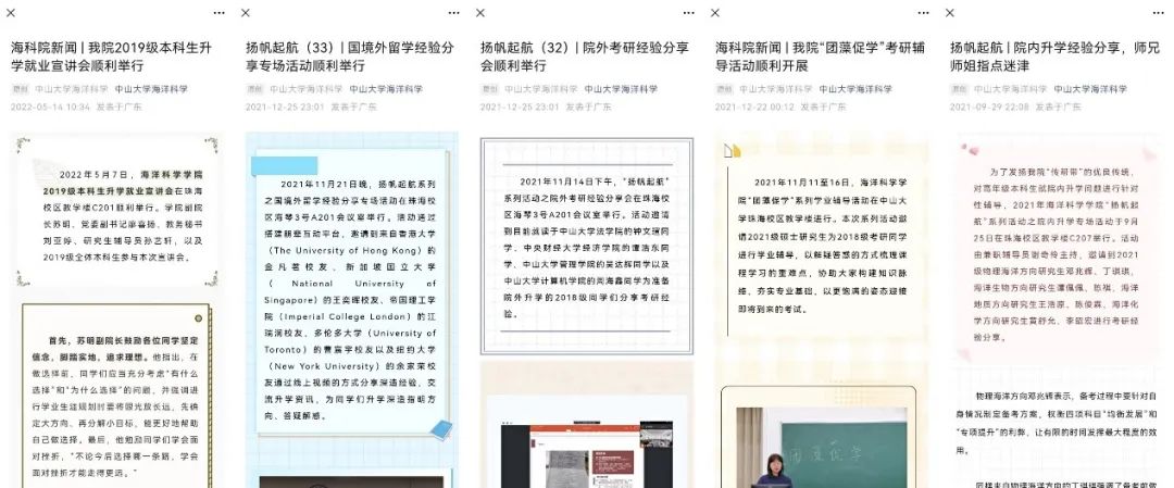 保研后,我开始承担兼职辅导员的工作,在过去的一年中先后参与组织了“扬帆起航”系列的院内、外升学和国境外留学经验分享会,“团藻促学”系列考研初试、复试经验分享会等活动,协助搭建朋辈之间沟通的桥梁,为毕业班有升学深造意向的同学们提供帮助。