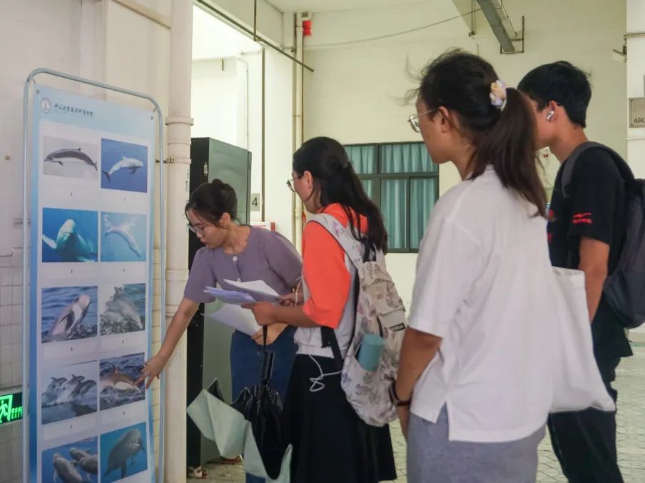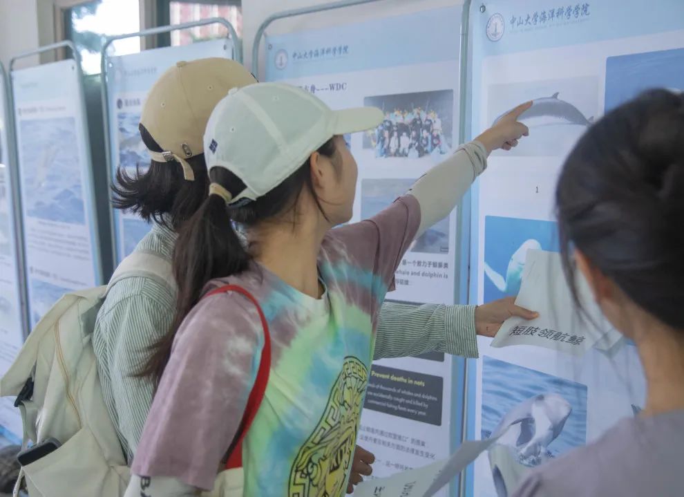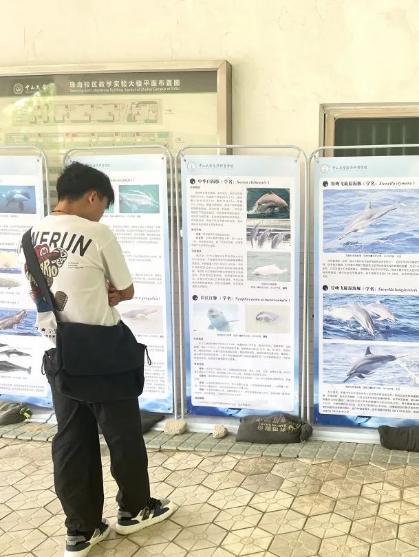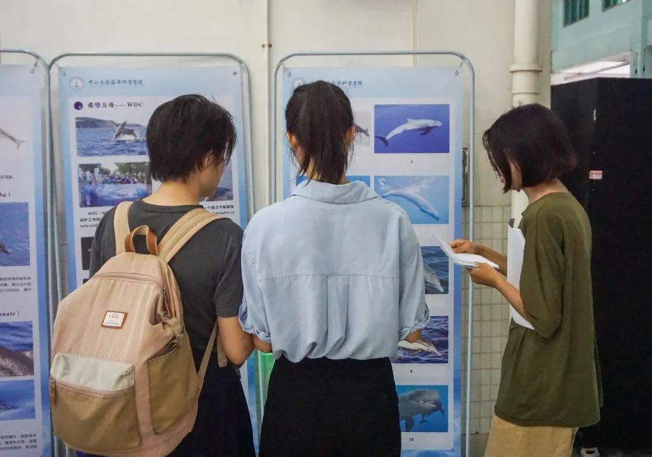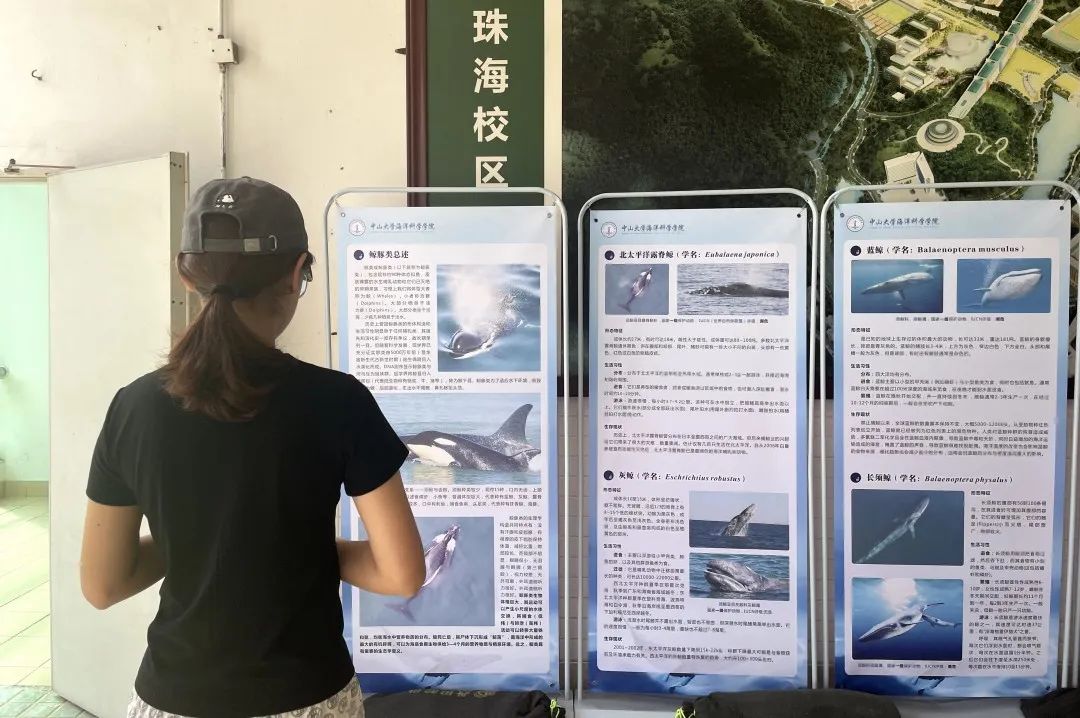 活动正式开始后,许多同学陆陆续续前来观展。大家可以选择在导览员的讲解下了解鲸豚知识,也可以选择自己安静赏阅展板内容来进一步加深对鲸豚的了解。