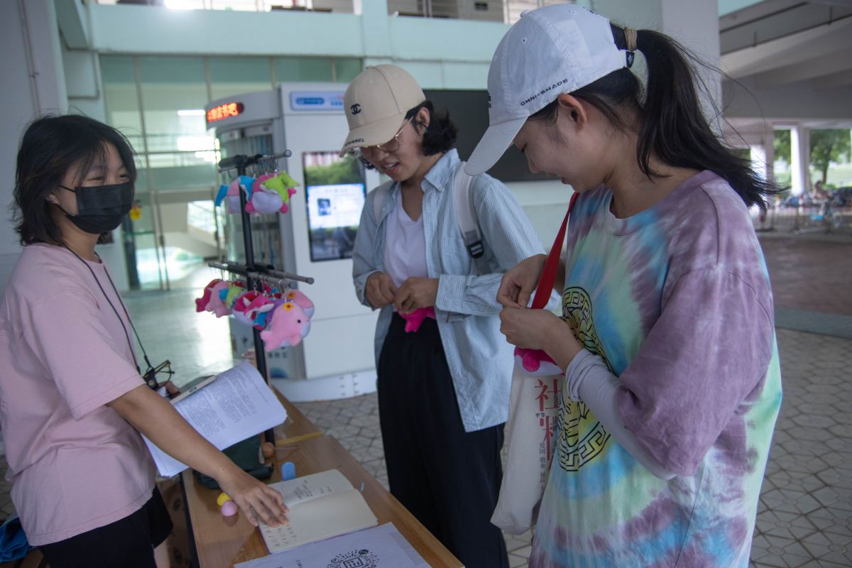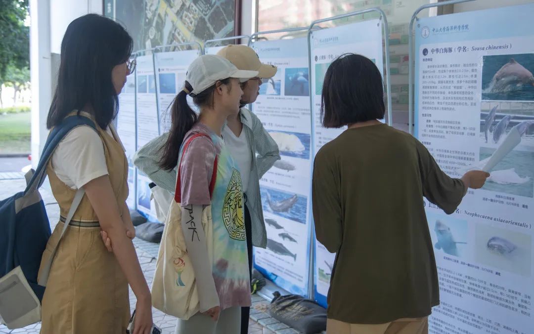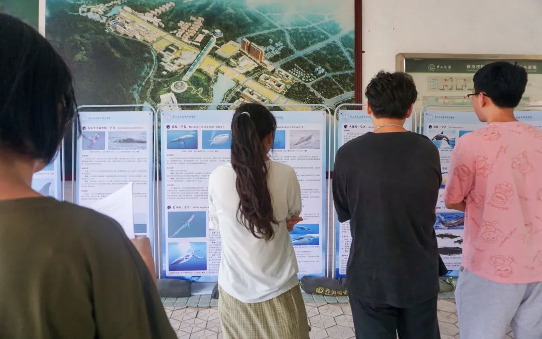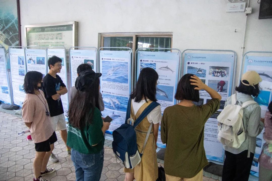 活动正式开始后,许多同学陆陆续续前来观展。大家可以选择在导览员的讲解下了解鲸豚知识,也可以选择自己安静赏阅展板内容来进一步加深对鲸豚的了解。