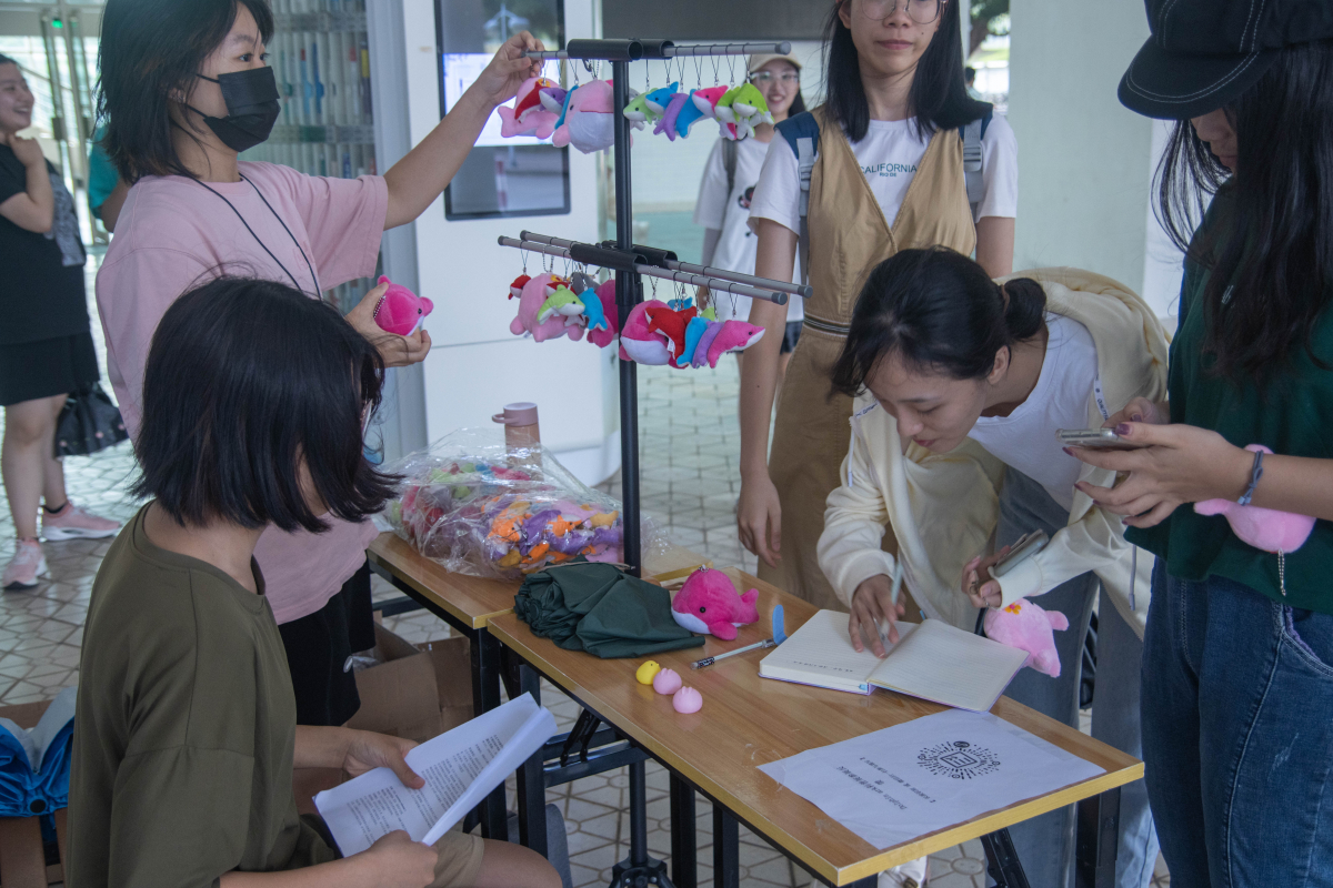 为了增加活动的趣味性,在观看完鲸豚总述、濒危鲸类、濒危豚类等展板后,我们还设立了互动小游戏展板。参与的同学们抽取鲸豚名字后,通过志愿者对于此类物种的形态特征的描述去指认展板上对应的鲸豚图片。