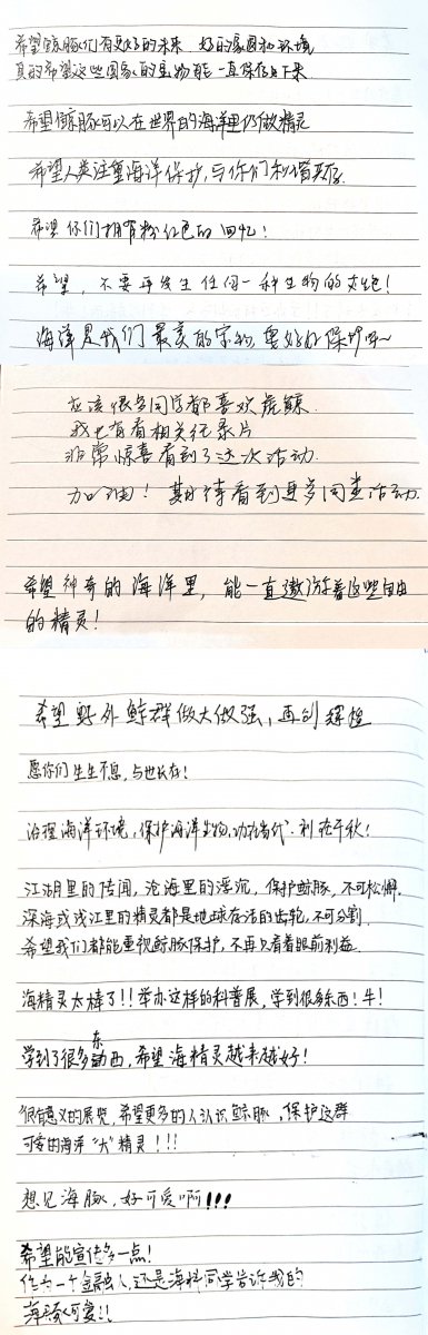观展后,同学们有感而发,在留言本上撰写各自对濒危鲸豚的美好祝愿。