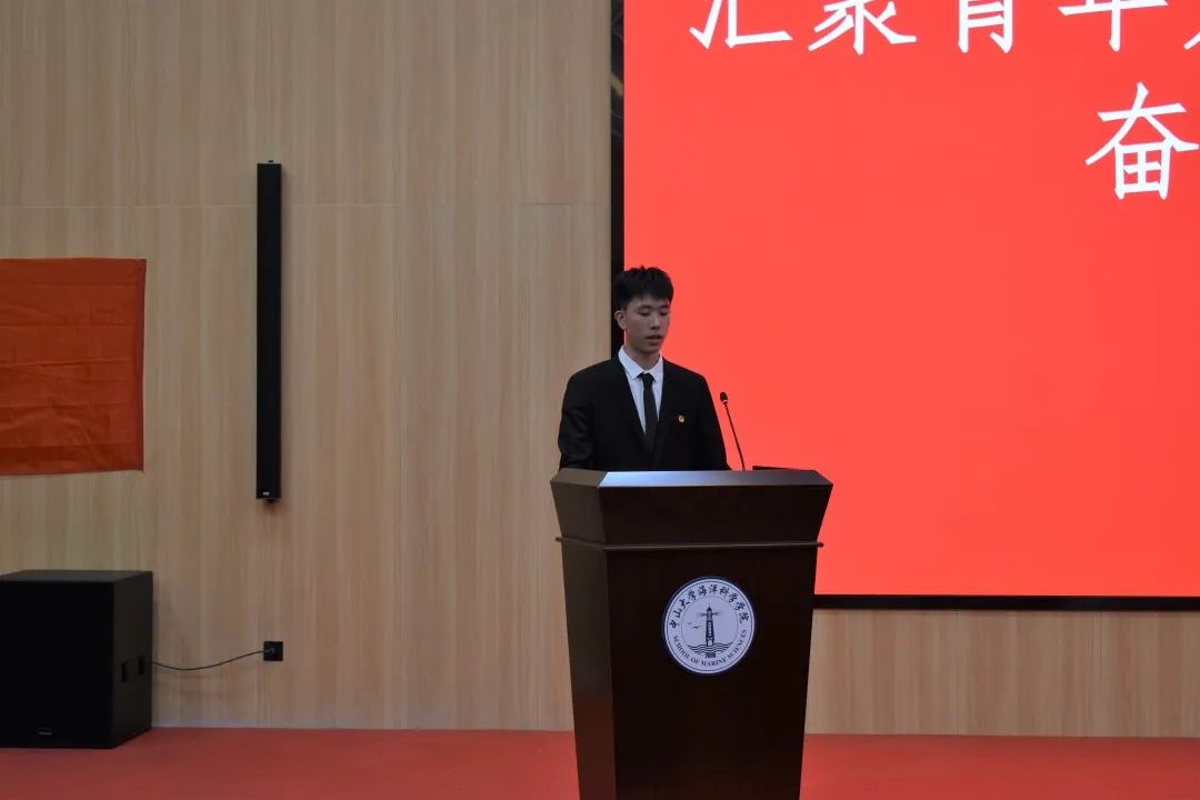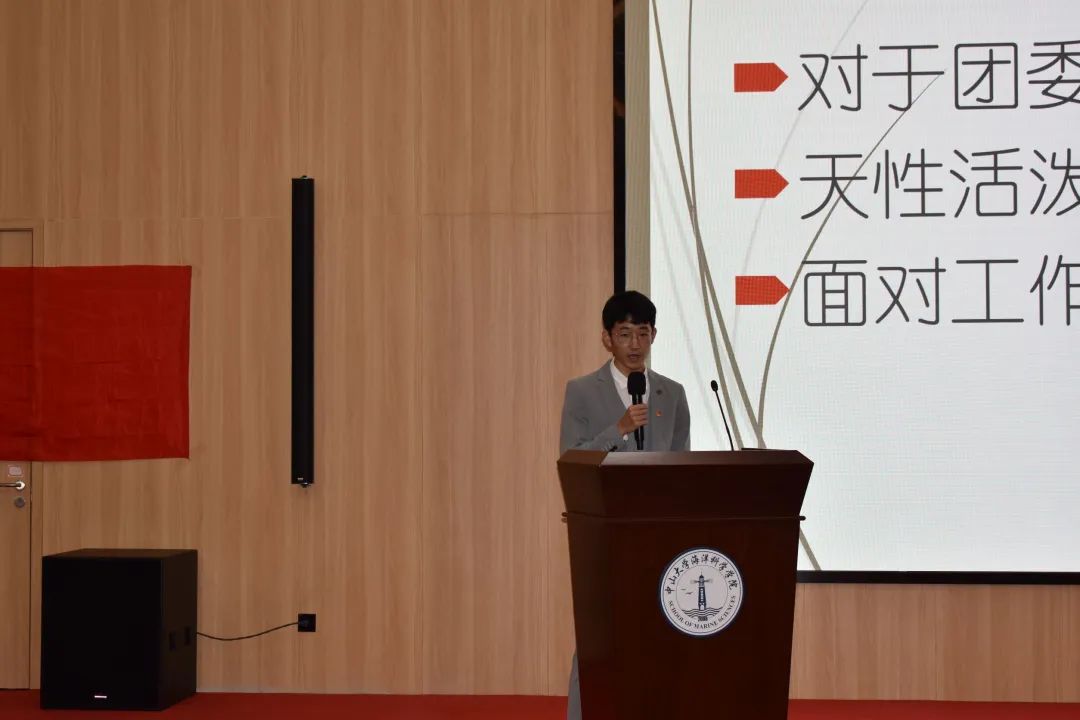 随后,学院党委副书记廖喜扬讲话。他首先对学院团委和学生会过去一年的工作表示充分肯定,同时对同学们的努力工作和辛苦付出表示衷心感谢。他希望同学们努力提高学习力、思想力和行动力,在学习生活中要积极向上,刻苦钻研、追求卓越,学好海洋专业知识;在思想上要厚植家国情怀,勤于思考、怀抱梦想、敢想敢为;在行动中要扎实肯干、脚踏实地,更好为同学服务。希望同学们认真学习二十大精神,牢记习近平总书记期望,立志做有理想、敢担当、能吃苦、肯奋斗的新时代好青年,让青春在全面建设社会主义现代化国家的火热实践中绽放绚丽之花。廖喜扬副书记还对同学们进行了纪律教育、安全教育、民族宗教政策宣讲等。