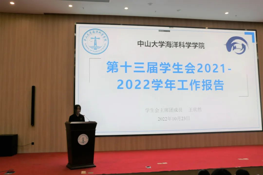 学院第十三届学生会主席团成员王欣然同学作《2021-2022学年度学生会工作报告》。回顾过去一年,我院学生会坚持全心全意为同学服务的宗旨,致力于加强内部建设,提升团队素养,活动前严抓业务培训,活动后落实总结反思。学术建设方面,“薪火相传”、“团藻促学”系列活动被评为中山大学学生会“我为同学做实事”精品服务项目。体育建设方面,承办长跑月,荧光夜跑和海蓝杯三人篮球赛等活动让同学们在锻炼之中收获乐趣。文化建设方面,“暖冬暖信”活动,“乐海遨游”歌手大赛、“镜觅碧海”主题摄影大赛和“守护蔚蓝”科普游园会等精彩活动让同学们感受到海科院的热情与灵动。