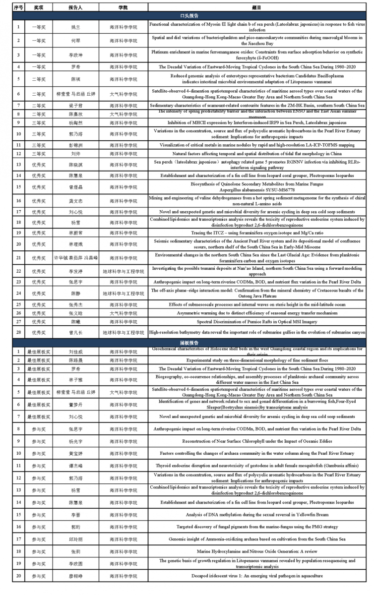 经过专家评审,姚兰、何翠、李政坤、罗希四名选手荣获口头报告一等奖,陈祺、柳莹莹、马启涵、丘婷、梁子君、陈嘉欣四组选手荣获口头报告二等奖,杨陶然、郭乃溶、彭锦洲、刘帅四名选手荣获口头报告三等奖,其余口头报告参赛选手获优秀奖。刘佳威、陈路晟、罗希、林子雅、柳莹莹、马启涵、丘婷、董梦丹、刘心悦七组选手获得最佳展板奖,其余展板报告参赛选手获参与奖。专家评委为各位获奖选手颁发奖状并表示热烈祝贺。