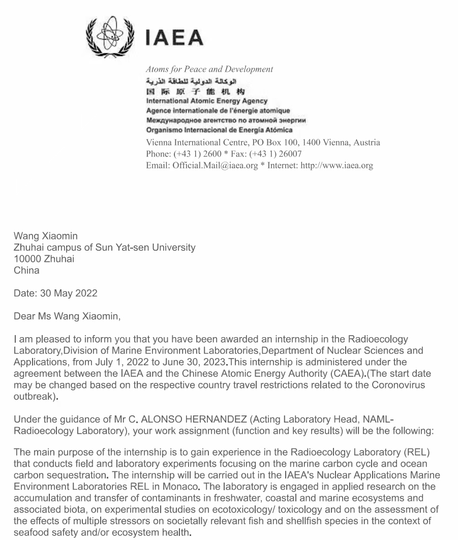我院2020级硕士生王晓敏同学经过学校遴选,以及国家原子能机构(China Atomic Energy Authority,CAEA)和国际原子能机构(International Atomic Energy Agency,IAEA)两轮面试选拔,获得了唯一的“评估海洋生物多应力效应的核与同位素技术”实习生岗位,并由国家留学基金委(CSC)国际组织实习项目的资助,于2022年7月赴摩纳哥(Monaco)国际原子能机构海洋环境实验室开展为期一年的实习。这也是中山大学海洋科学领域首位前往国际组织实习交流工作的学生。