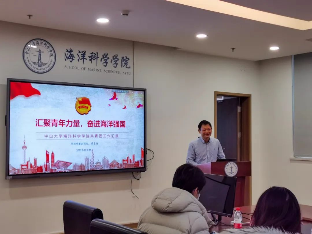 廖喜扬副书记从“夯实组织建设、强化思想引领、服务青年成长以及投身社会实践”四个方面介绍了学院团委在政治建设、组织建设、联系服务和作用发挥等方面的工作举措和取得的成绩,重点介绍了青马学堂、主题团日活动、创新创业训练和学科竞赛、社会实践志愿服务等特色亮点,以及团藻促学计划、“海纳百川”模拟国际学术论坛、海洋科技文化节、“海·阳”体育计划、“海·韵”美育计划等品牌活动项目,系统汇报了学院共青团工作的体系和成效。他强调,学院团委将带领广大团员、团干认真学习贯彻二十大精神,更好引领凝聚青年,组织动员青年,联系服务青年,促进青年成长,汇聚青年力量,奋进海洋强国。
