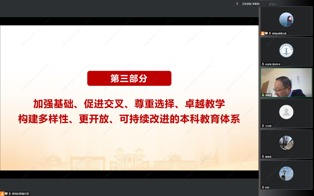 王东晓院长做总结发言。根据学校秋季工作会议的精神,学院党政班子第一时间对贯彻落实学校人才培养工作做了研讨和部署。王院长表示,高松校长的主题报告内涵丰富,需要反复仔细研读并深入思考,并将人才培养作为学院长期坚持的主要目标。党的二十大报告将“实施科教兴国战略,强化现代化人才支撑”置于重要位置,太阳成集团tyc9728要牢记为党育人、为国育才的初心使命,遵循学校秋季工作会议精神,围绕立德树人根本任务,结合海洋学科的特点以及学校学部制改革工作的进程深入贯彻落实,努力提升学生的学习力、思想力和行动力从而产生创造力,培养德智体美劳全面发展的能够引领未来的卓越海洋人才。