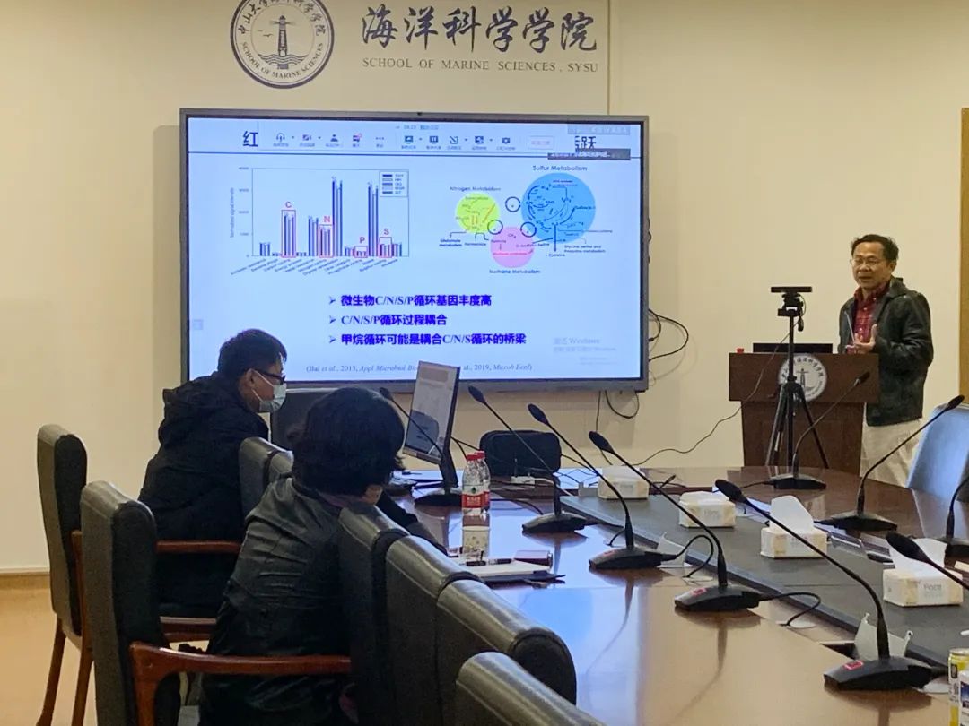 在本次讲座中,贺志理教授向大家分享了红树林湿地沉积物微生物组多样性及其生态功能,揭示了碳氮硫循环关键微生物类群、关键基因及其垂直分布规律,探索了甲烷代谢、反硝化、硫氧化、硫酸盐还原等关键过程的潜在耦合机制。该研究为缓解全球变暖、实现碳中和提供理论基础与技术支撑。报告结束后,中国海洋大学董云伟教授,太阳成集团tyc9728龚俊教授、刘岚教授、谢伟副教授和同学们积极提问,热切交流。最后王东晓院长对会议进行了总结,鼓励大家更好的利用广东省海洋资源与近岸工程重点实验室平台进行学术交流,和科研合作。