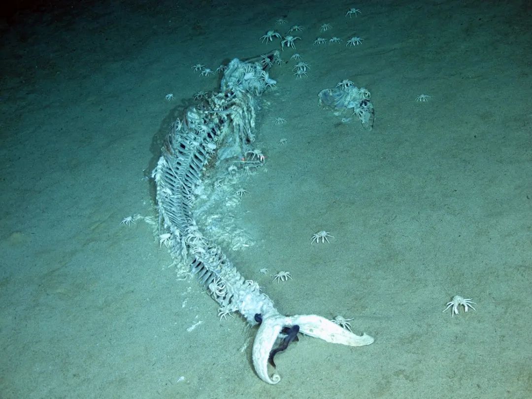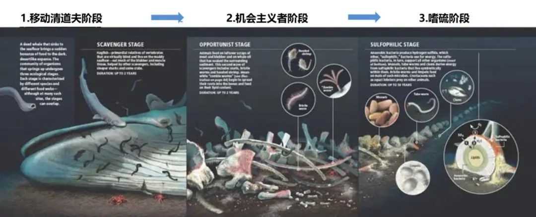 鲸落被认为是维持深海生命和生态的驱动性食物来源,鲸鱼尸体分解的不同阶段支持着从大鲨鱼到微小细菌等生物群落的演替。第一阶段被称为移动清道夫阶段,即鲨鱼和螃蟹等食腐动物清除鲸鱼的软组织。第二阶段为机会主义者阶段,其他的异养动物利用较大的食腐动物提供的剩余食物,它们在鲸落周围的沉积物中定居下来,并在鲸骨上或鲸骨内清除任何的残留物。第三阶段是嗜硫阶段,该阶段以化能自养过程为主要特征,鲸骨腐烂时产生硫化氢,某些细菌可以直接从硫中获取能量,而较大的生物则依赖于它们体内的硫细菌而生活。鲸的有机质被完全消耗后,其骨骼会矿化形成礁岩,仍旧是许多海洋生物的聚居地(图2)。