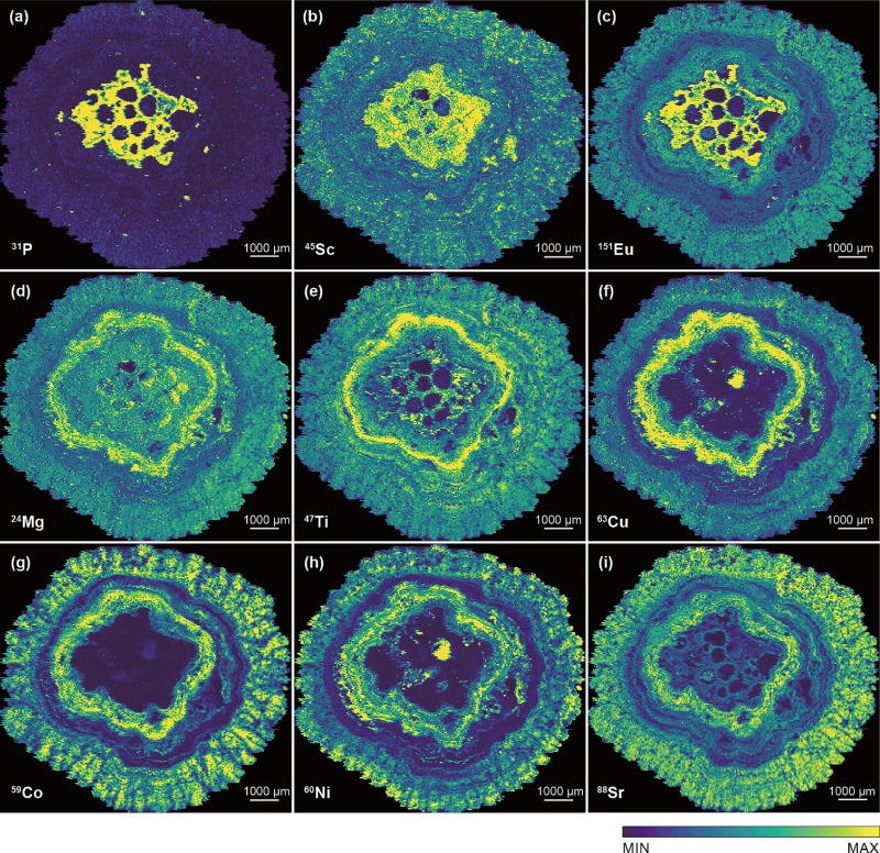 多金属结核是深海早期成岩过程中最为广泛和关键的金属储库之一。包括钇和稀土元素(REY)在内的关键金属元素具有巨大的经济价值,因此,开展其源-汇过程和富集机制研究至关重要。元素成像是一种地球化学可视化技术,常用于指示元素浓度的空间分布规律,是矿物中元素的富集机制和赋存状态等研究的重要手段。然而,传统元素成像技术的分析时间长且空间分辨率低,其无论在大尺度(几毫米)还是小尺度(几十微米)应用场景中都面临很多问题,仍需改进和优化。