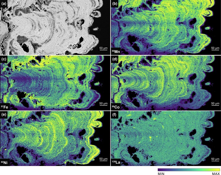 (a)具微层结构的微区BSE图;(b-f)LA-ICP-TOFMS微量元素成像图