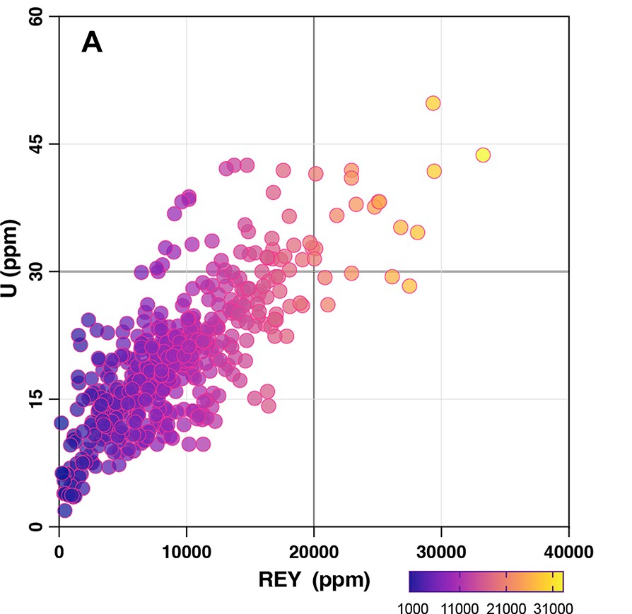 深海富稀土沉积物被认为是一种潜在的稀土矿产资源,其总稀土含量可高达8000 ppm,并且含丰富的中重稀土资源。现有研究已发现,稀土元素含量与磷酸盐呈正相关,厘定了沉积物中最主要的稀土赋存矿物是生物质磷灰石(图1)。然而,深海稀土富集的时间规律研究还十分薄弱,阻碍了成矿理论发展和后续的资源勘探开发。