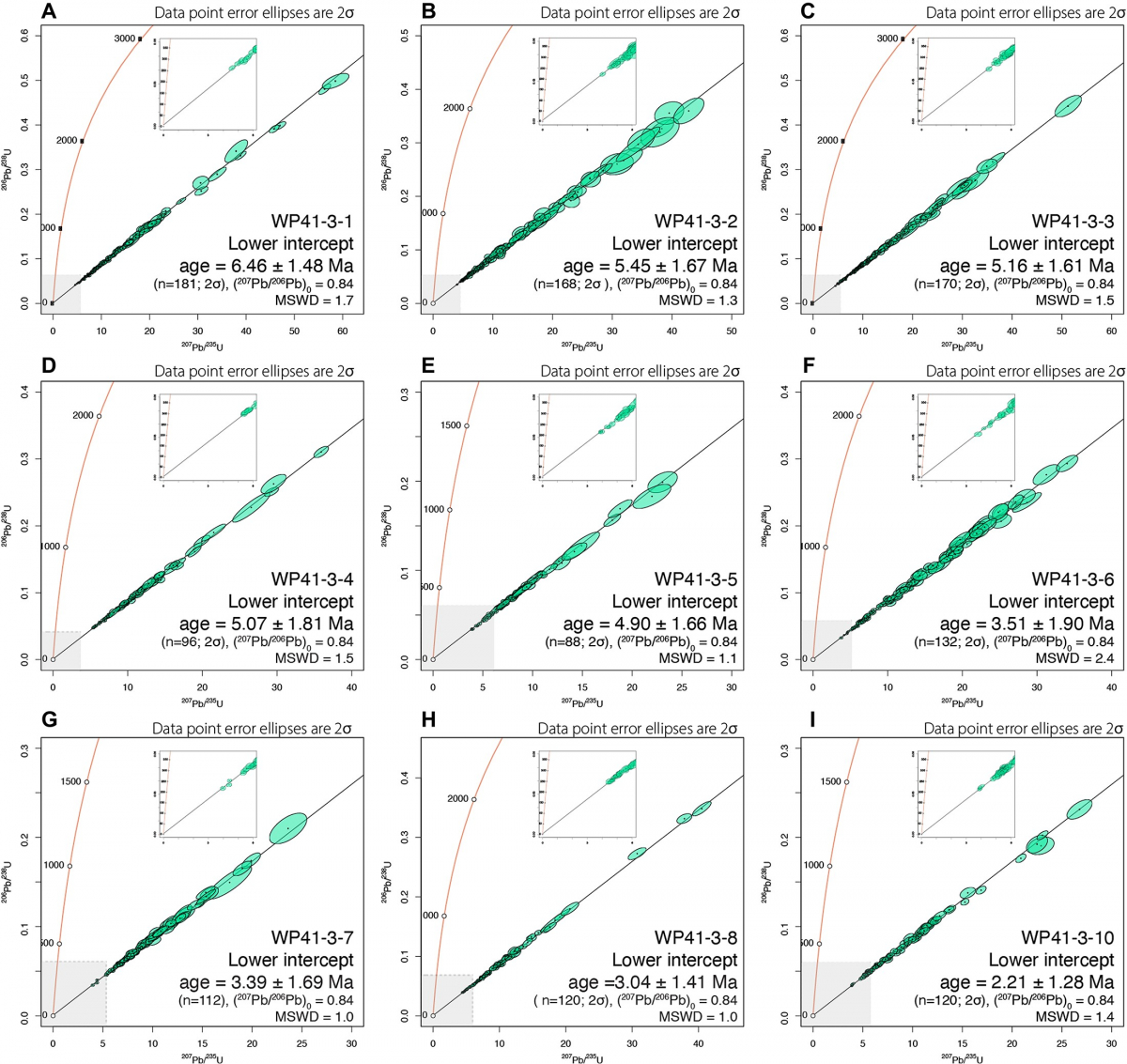图 3 西太平洋富稀土沉积物中鱼牙的U-Pb Wetherill谐和图,数据椭圆和年龄误差均为2σ
