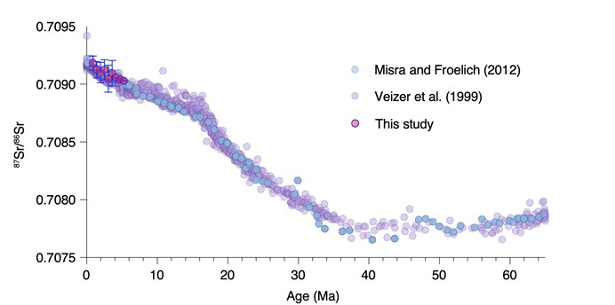 基于以上研究,我院海洋地质与地球化学研究团队开展了深海沉积物中生物磷灰石的U-Pb年代学研究工作。研究团队获取了具有较好年龄框架的IODP钻孔样品,挑选其中的鱼牙开展了生物磷灰石U-Pb年代学验证。结果表明,IODP钻孔中鱼牙U-Pb定年结果与微体古生物年代在误差范围内一致,说明生物磷灰石U-Pb年代计较为可靠。在此基础上,研究团队将磷灰石U-Pb年代学应用于西太平洋富稀土沉积物样品中,U-Pb定年结果从底部到顶部为6.22百万年到2.16百万年(图3),同时该年代学还得到了鱼牙原位Sr同位素结果的验证(图4),有效证明了该区域内存在一期中新世稀土矿化事件。该方法的成功运用将有助于各个海域的稀土富集时代研究,并揭示沉积物不同深度稀土富集事件。