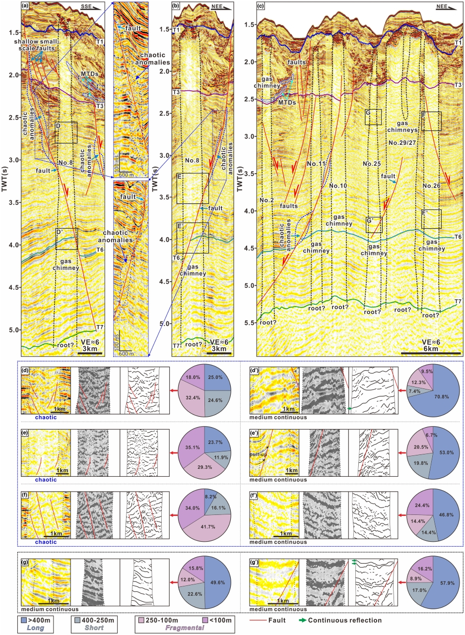 我院深水沉积过程与资源效应研究团队利用高分辨率三维地震数据,在神狐海域(南海北部珠江口盆地的天然气水合物试采区)识别了59个气烟囱,其中35个与断层相交。在气烟囱-断层相交界面之上,气烟囱内部地震反射结构以杂乱且不连续的反射为主(图1)。相交界面下方的内部反射结构显示出更多的连续反射特征,这种连续的反射特征在不与断层相交的气烟囱中也很常见(图1、2)。更高程度的杂乱或不连续地震反射可能表明气烟囱内部裂隙网络更为破碎化。这可能是由于断层为气烟囱提供了额外的流体通量并增加了内部流体压力所造成的。