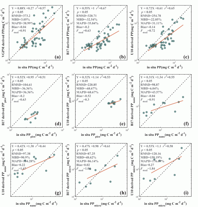 图1 遥感估算与现场观测的总初级生产力和分粒级初级生产力的比较