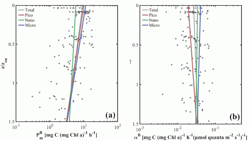 图2 不同粒级浮游植物P-E曲线参数的剖面分布拟合结果
