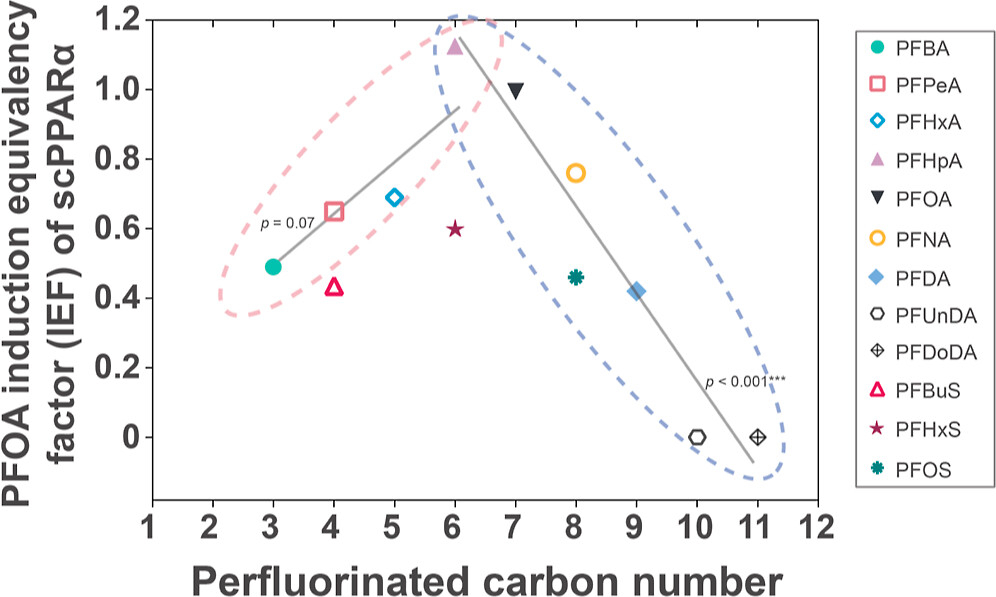 我院海洋鲸类与环境保护研究团队近期通过体外方法揭示了12种典型PFASs对中华白海豚和人类PPAR三种亚型(PPARα、PPARβ/δ、PPARγ)的转录激活效应。结果表明,除PFUnDA和PFDoDA外,其它10种PFASs均可引起中华白海豚PPARα(scPPARα)受体的转录激活(图1),按照诱导等效因子(IEF)由大到小排序如下:PFHpA > PFOA > PFNA > PFHxA > PFPeA > PFHxS > PFBA > PFOS > PFBuS ≈ PFDA ≫ PFUnDA = PFDoDA(未激活)。部分PFASs亦可对中华白海豚PPARβ/δ和PPARγ产生激活效应。进一步研究表明,组织(如肝脏)相关剂量的PFASs即可引起中华白海豚PPARα受体通路转录激活,进而可能对珠江口中华白海豚产生健康威胁。