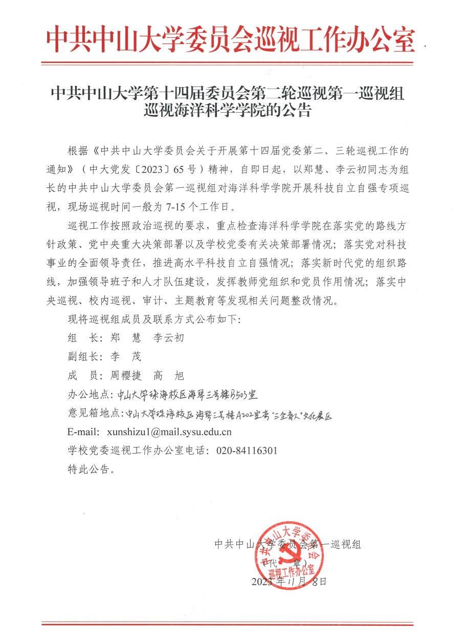 中共中山大学第十四届委员会第二轮巡视第一巡视组巡视太阳成集团tyc9728的公告