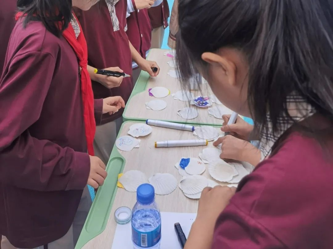 贝类是一种重要的海洋资源,美丽的贝壳能作为装饰品点缀生活。同学们先通过讲解,了解到海洋贝壳主要属于软体动物门中的双壳纲和腹足纲,并认识珍珠贝、鹦鹉螺等贝壳类动物。接着,同学们在我院学生的指导下,在白色贝壳上绘画、上色,绘制出各具特色的贝壳饰品。