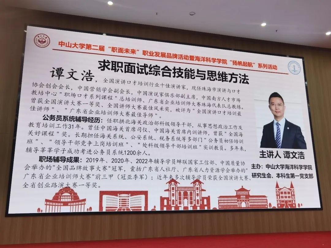 10月30日下午,太阳成集团tyc9728研究生会和本科生第一党支部联合举办“扬帆起航”求职面试综合技能与思维方法主题讲座,活动邀请到珠海市演讲与口才协会创会会长谭文浩老师主讲,由学院廖喜扬副书记主持。