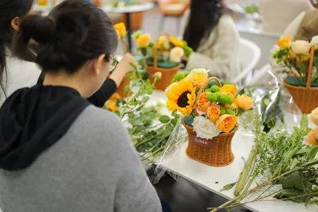 随后,由专业的花艺老师进行插花知识与技巧讲解。花艺师从选择花材、大小、主次、颜色的搭配等方面介绍了有关插花艺术的知识,详细讲解了如何选取颜色搭配、如何定制造型等插花要点,并亲手展示了插花步骤。