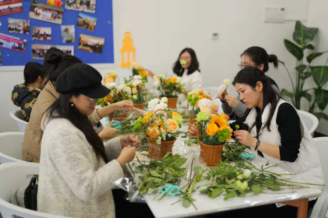 活动现场,教职工们互相交流心得,分享彼此的作品,笑声和赞美声此起彼伏。这不仅是一场插花活动,更是一次女性间的交流盛会,彰显女性的力量与美好。活动结束后,大家纷纷与自己创作的花篮作品拍照,记录这美丽的一刻。