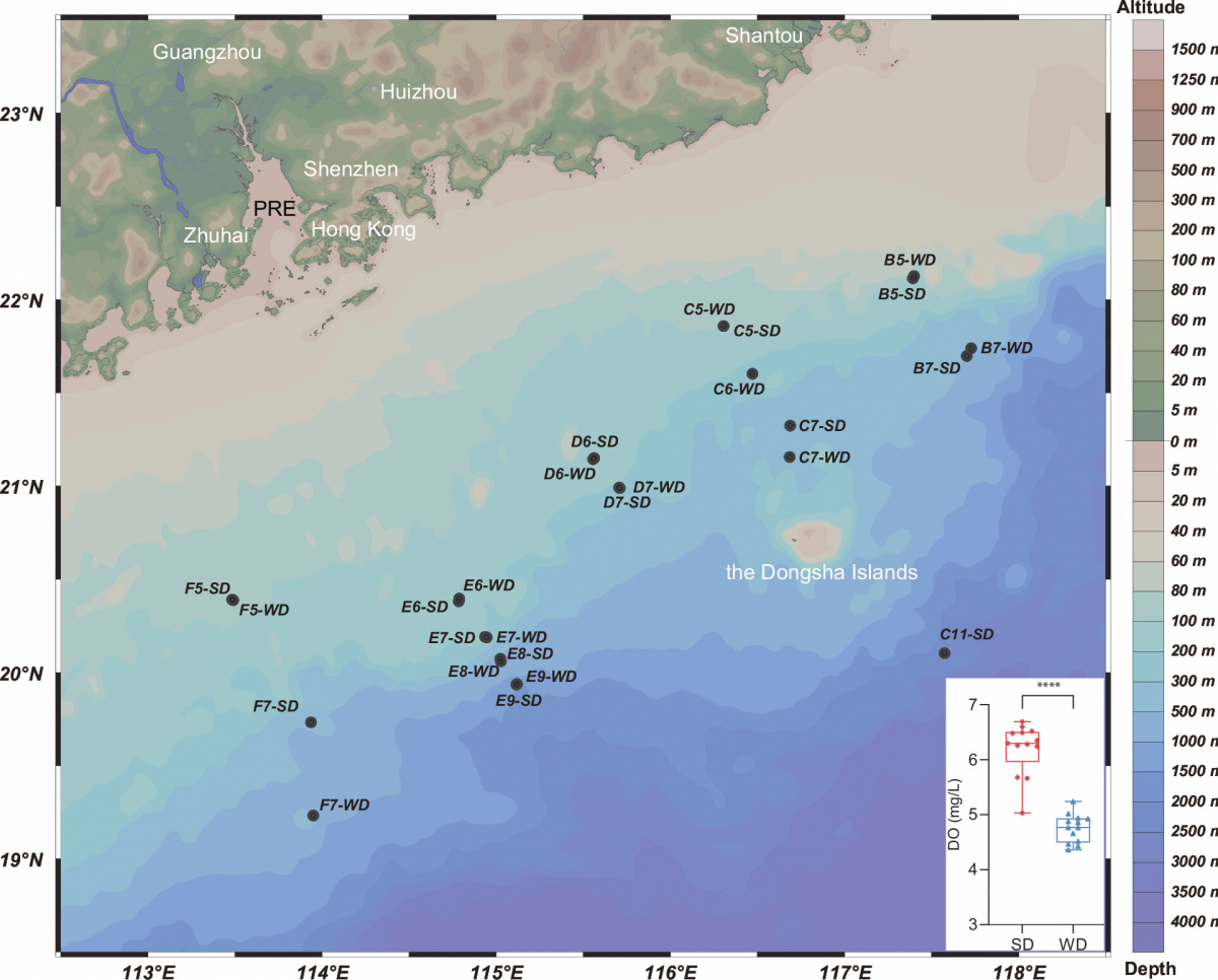 图1. 本研究站点图及不同季节叶绿素最大层氧气浓度比较(中山大学南海科学考察计划2016年夏季及2018年冬季航次)