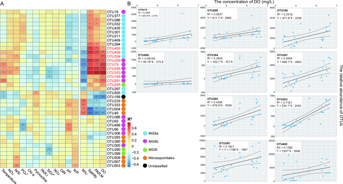 氧气是很多生物生命活动必不可少的物质,但随之而来的氧化压力也会对细胞造成损伤。其中,以超氧化物阴离子为代表的活性氧是造成氧化损伤的主要物质。MGII古菌作为在全球表层海水中广泛分布的类群,其所受氧化压力更高,但MGII的抗氧化能力及其在氧化压力影响下的进化历程目前仍不清楚。研究团队通过参加中山大学南海科学考察2016年夏季航次及2018年冬季航次,获取南海北部13个站点叶绿素最大层古菌群落结构及其基因组数据,分析发现一部分MGII与溶解氧的浓度呈显著正相关,而另一部分MGII则没有相关关系。进一步基于相应基因组的分析发现, MGII的17个属分别有且仅有铁-锰超氧物歧化酶(Fe/MnSOD)或镍超氧物歧化酶(NiSOD)中的一种,而这些受到溶解氧浓度促进的MGII多属于含Fe/MnSOD的类群,且相关性更高,说明Fe/MnSOD可以帮助MGII更好地抵御高溶解氧浓度带来的氧化压力。