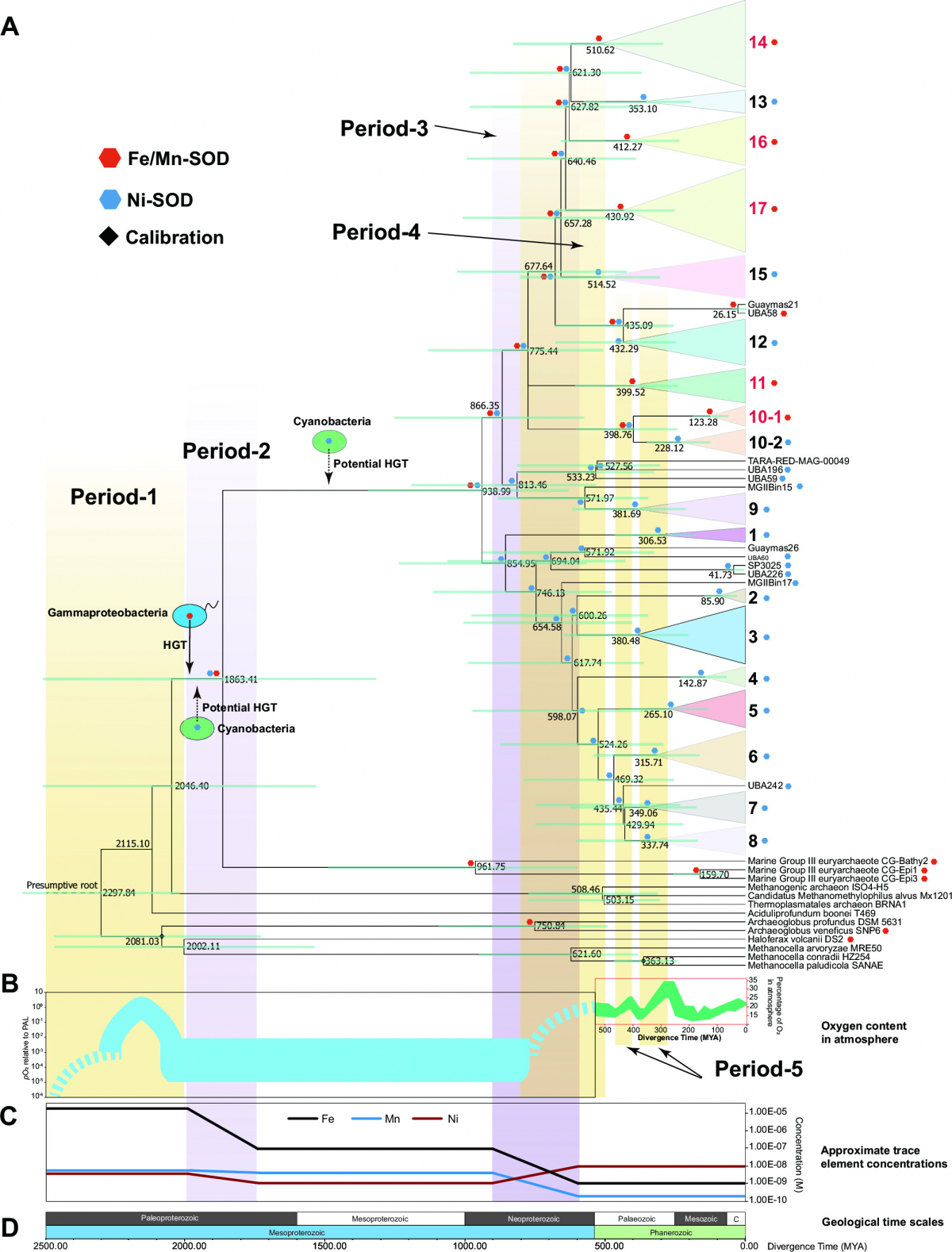 基于系统发育分析和分子钟的进一步研究发现,MGII的SOD基因是其祖先在大约18亿年前基于水平基因转移从细菌处获得的。在距今约9亿年前,MGIIa和MGIIb发生分化,同时两种SOD基因也随之发生了分配,其中MGIIb同时继承了两种SOD后又在一段时间(约6亿年)内发生了连续的物种分化和SOD基因在子代中的分配过程,并最终形成了如今SOD基因在MGII的不同亚群种的分配模式。在整个MGII物种和SOD功能基因分化的过程中,几乎全部分歧时间节点都伴随着对应历史时期氧气浓度的升高事件(例如第一次大氧化时间),并和海水中Fe、Mn、Ni等痕量金属元素的浓度变化呈现一定的对应关系。这进一步说明,地球氧气浓度及海水部分金属元素浓度的变化,在MGII古菌的适应性演化过程中发挥着重要作用。该研究对于我们理解海洋微生物与地球环境的共演化过程具有重要意义。