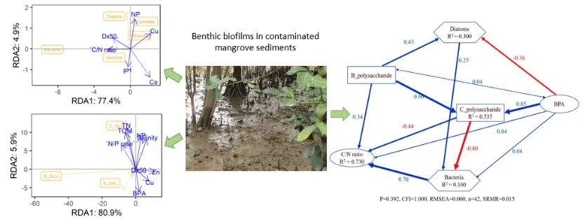 为解决水体痕量污染物快速分析的技术瓶颈,杨丽华以微萃取衍生化技术为突破口,系统介绍了其技术方法原理与应用(Springer International Publishing, 2017)。同时采用固相微萃取衍生化技术建立了水体/血液样品中多种内分泌干扰物和类固醇激素同时分析的快速灵敏方法(J. Chromatogr. A, 2006, 1104(1-2): 23-32;Anal. Bioanal. Chem., 2006, 386(2): 391-397);采用原位衍生化-中空纤维膜液相微萃取技术建立了污水样品中多种磺胺的同时分析技术(J. Sep. Sci., 2018, 41(7): 1651-1662)。此外,基于海洋生态环境调查,揭示了潮位、季节和不同红树林对湿地微生物膜特征及相应环境和污染因子的影响(Mar. Pollut. Bull., 2023, 194: 115283-115283; Front. Mar. Sci., 2022, 9: 1043826);解析了红树林湿地中硅藻是微生物膜的构建者,而酚类和重金属是影响微生物膜组成的关键污染因子(Sci. Total Environ., 2023, 857: 159391);且酚类在虎门河口水体中主要赋存在溶解相,盐度可驱使其向海洋沉积物中富集(Environ. Pollut., 2016, 211: 58-66)。该研究近年来获广东省自然科学基金面上项目(No. 2021A1515011397)资助,相关成果为探究真实条件下的海洋生态环境问题提供了研究依据。