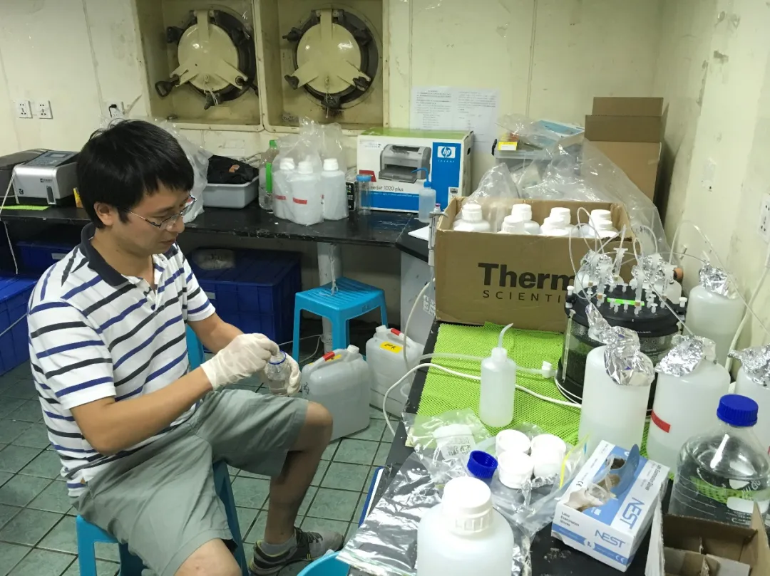 李朋辉在马里亚纳海沟科学考察航次过程中进行固相萃取实验