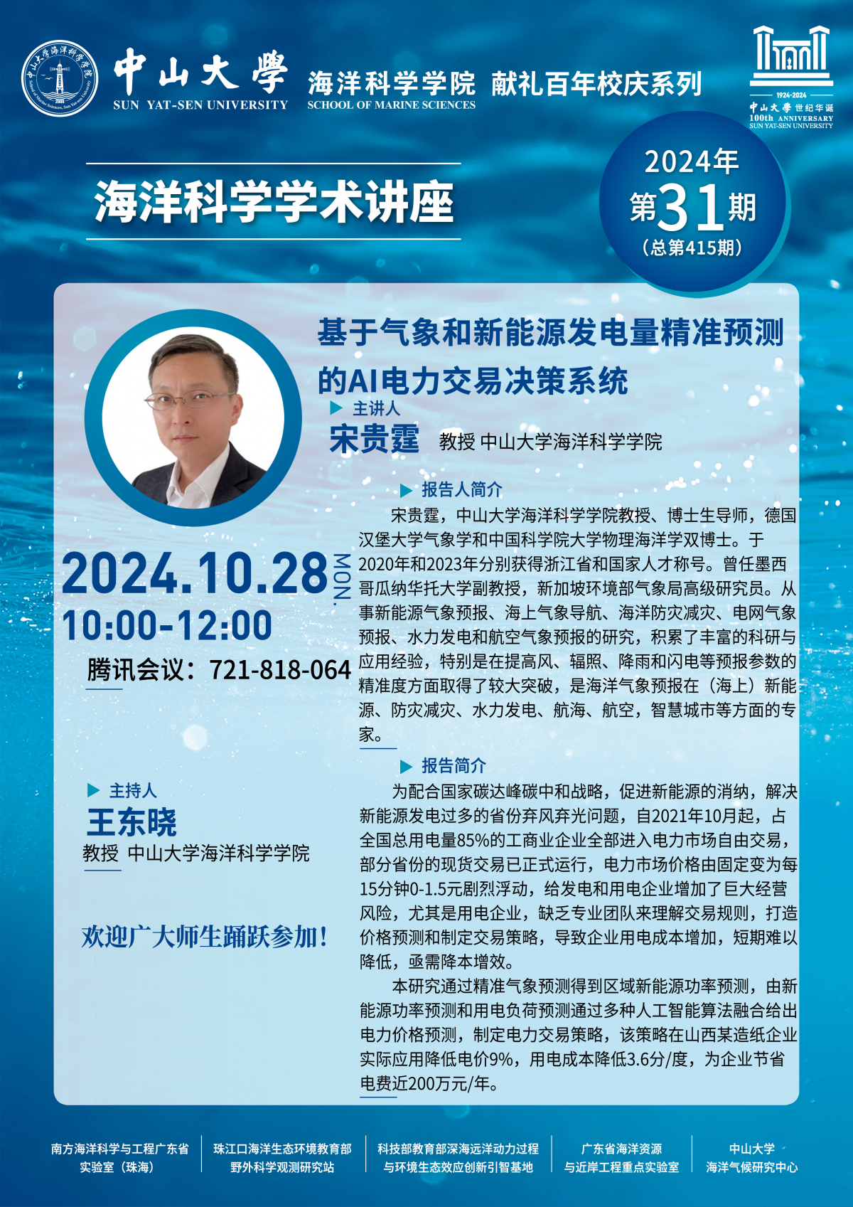 海洋科学学术讲座预告第415期:基于气象和新能源发电量精准预测的AI电力交易决策系统