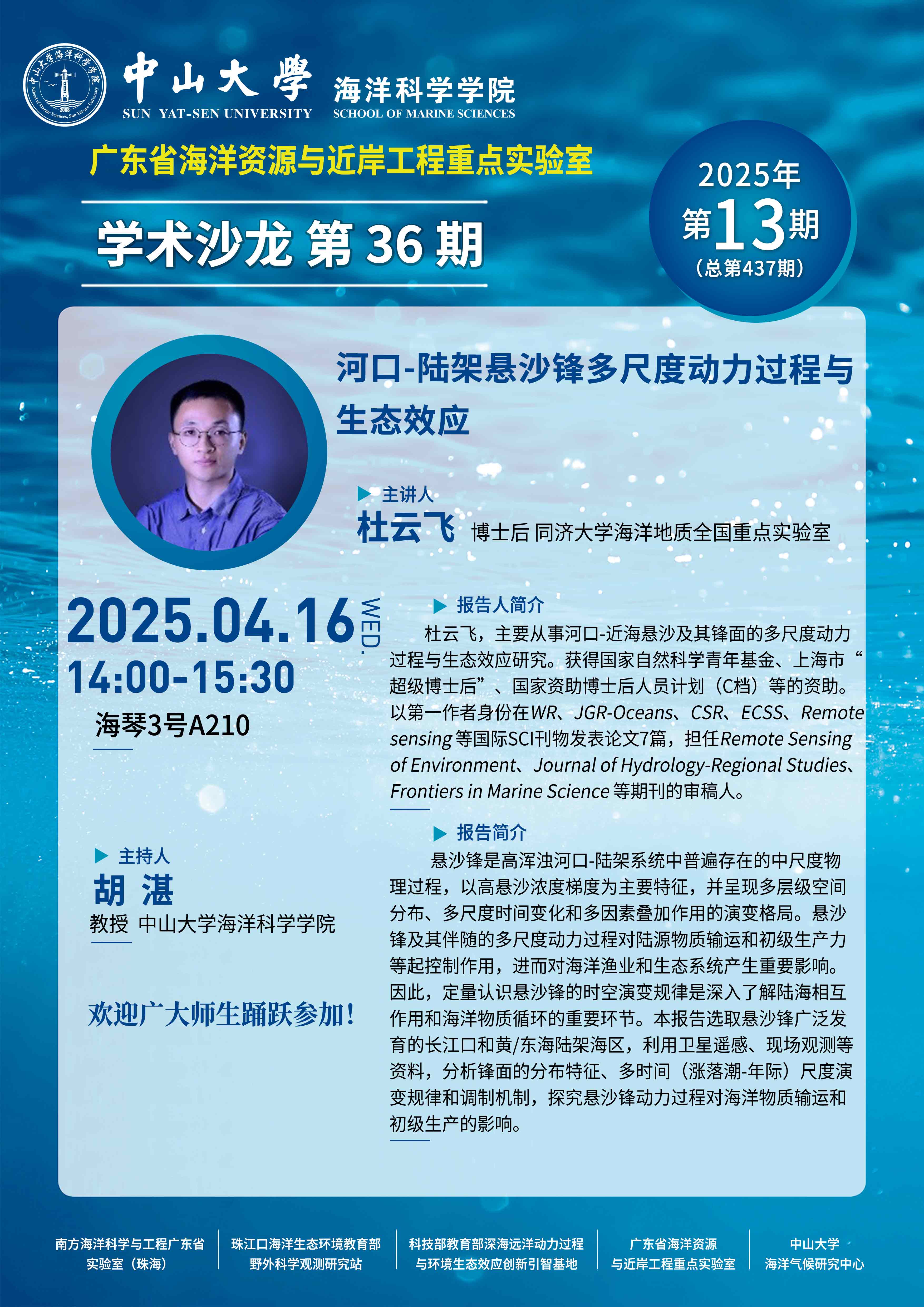 海洋科学学术讲座预告第437期:河口-陆架悬沙锋多尺度动力过程与生态效应