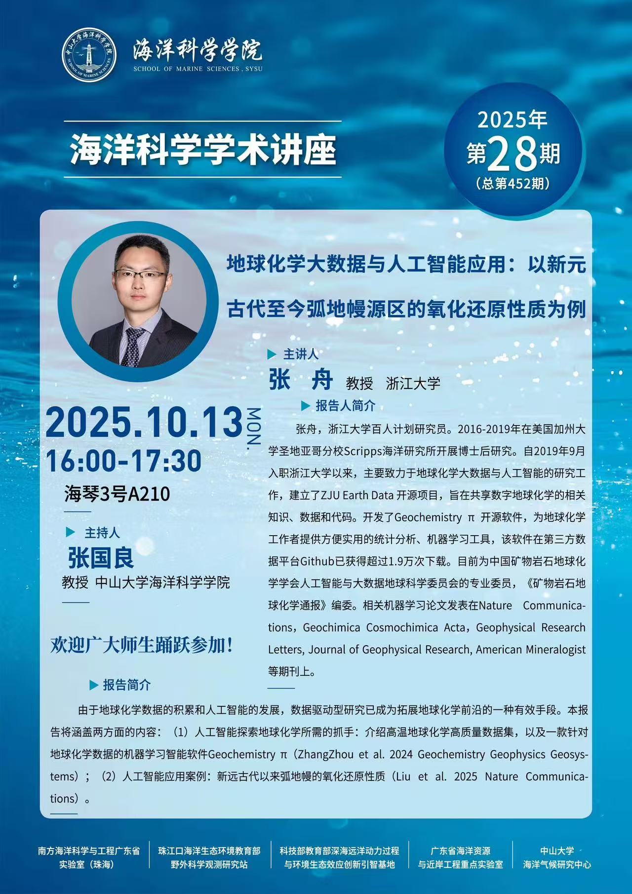海洋科学学术讲座预告第452期:地球化学大数据与人工智能应用:以新元古代至今弧地幔源区的氧化还原性质为例