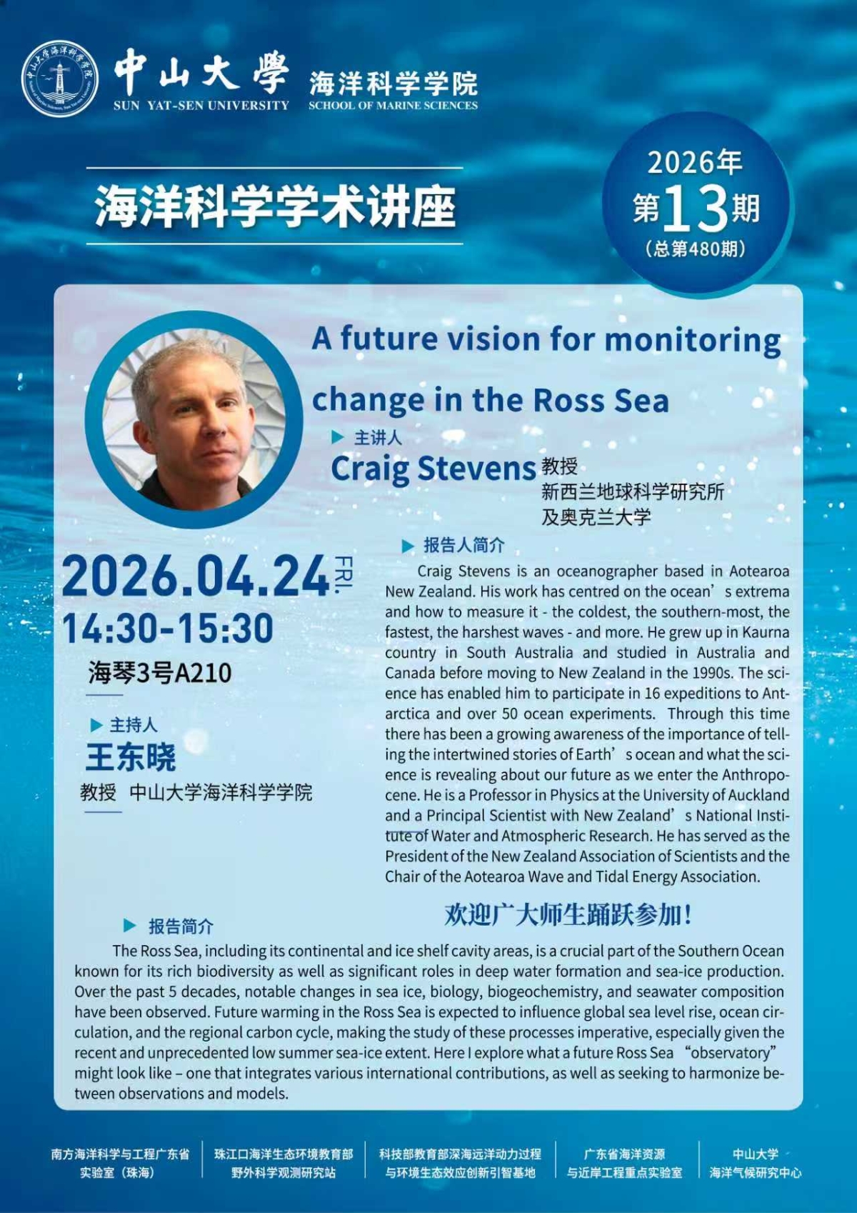 海洋科学学术讲座预告第480期:A future vision for monitoring change in the Ross Sea 罗斯海变化监测的未来愿景
