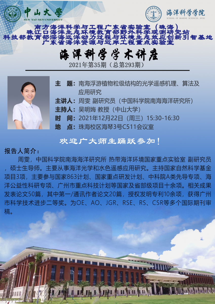 海洋科学学术讲座预告第293期:南海浮游植物粒级结构的光学遥感机理、算法及应用研究
