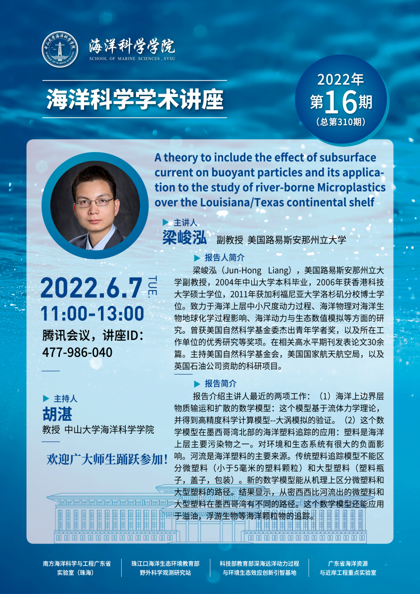 海洋科学学术讲座预告第310期:A theory to include the effect of subsurface current on buoyant particles and its application to the study of river-borne Microplastics over the Louisiana/Texas continental shelf